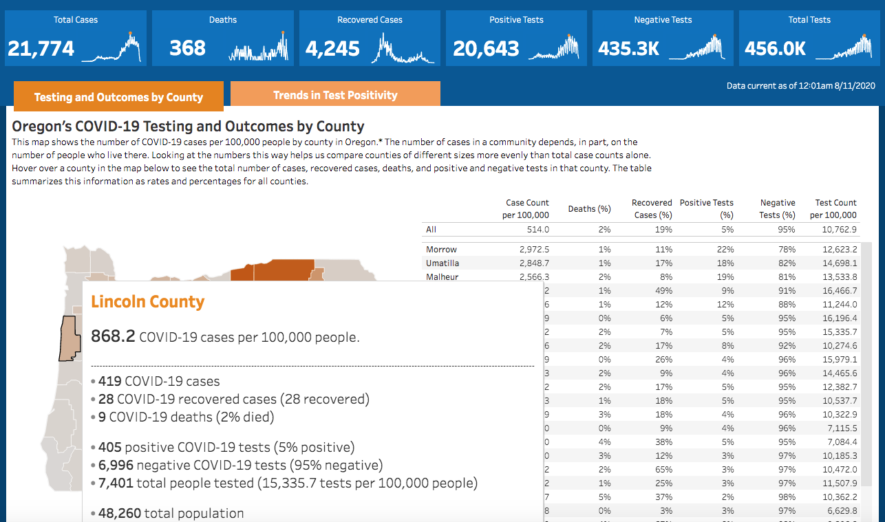 Oregon Health Authority’s coronavirus report for Friday, Aug. 14; Lincoln County has 3 new cases