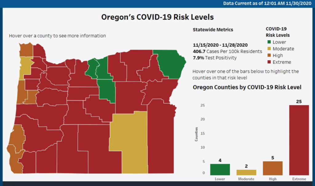 By QUINTON SMITH/YachatsNews.com A two-week surge in COVID-19 cases has pushed Lincoln County into the state’s new “high risk” category Thursday, resulting in tighter limits on social and business activities than forecast last week. The statewide two-week “freeze” on many activities instituted Nov. 18 by Gov. Kate Brown ended Wednesday. But the growing number of cases not seen since