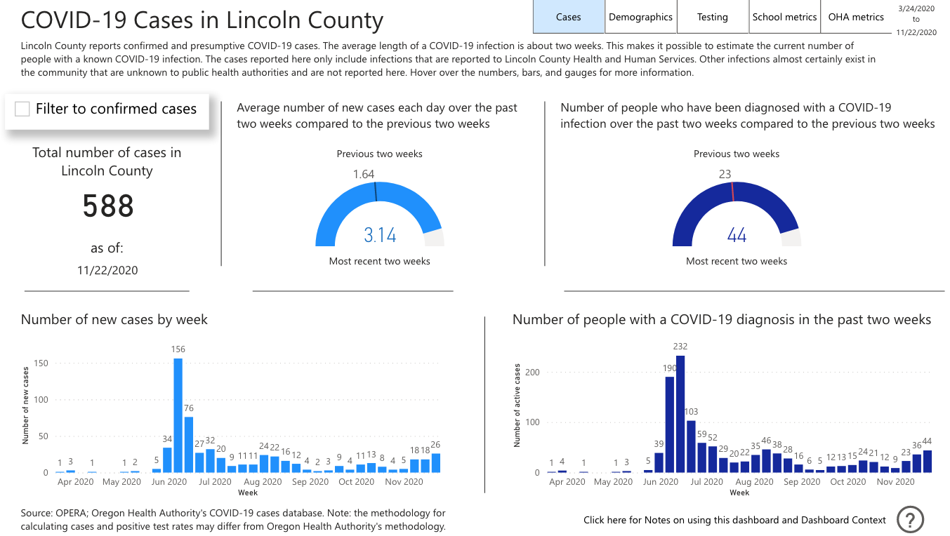 By QUINTON SMITH/YachatsNews.com The Oregon Health Authority on Thursday announced that a 72-year-old Lincoln County woman tested positive for COVID-19 last week, one day after her death. The woman had underlying health issues and died Nov. 16 at her residence, the OHA said. Tests revealed the virus the next day. It was the second COVID-19 related death from last