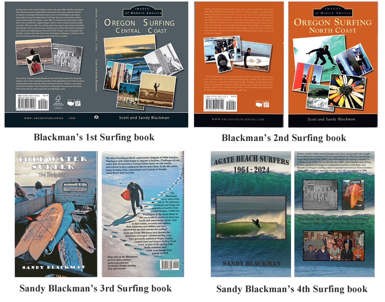 Writing to preserve history has been part of Blackman’s life for 40 years and what she has done full time since she retired in 2005 as a counselor at Toledo High School. She married Scott Blackman in 2002. When one of his original surfing buddies, Marty Skriver, passed away they decided to write about the history of surfing in Oregon, fearing that the stories would be lost over time. Together they wrote two books, Oregon Surfing Central Coast and Oregon Surfing North Coast. Since her husband’s death, Sandy Blackman has written two more, Cold Water Surfer: The Early Days and Agate Beach Surfers 1964-2024.
