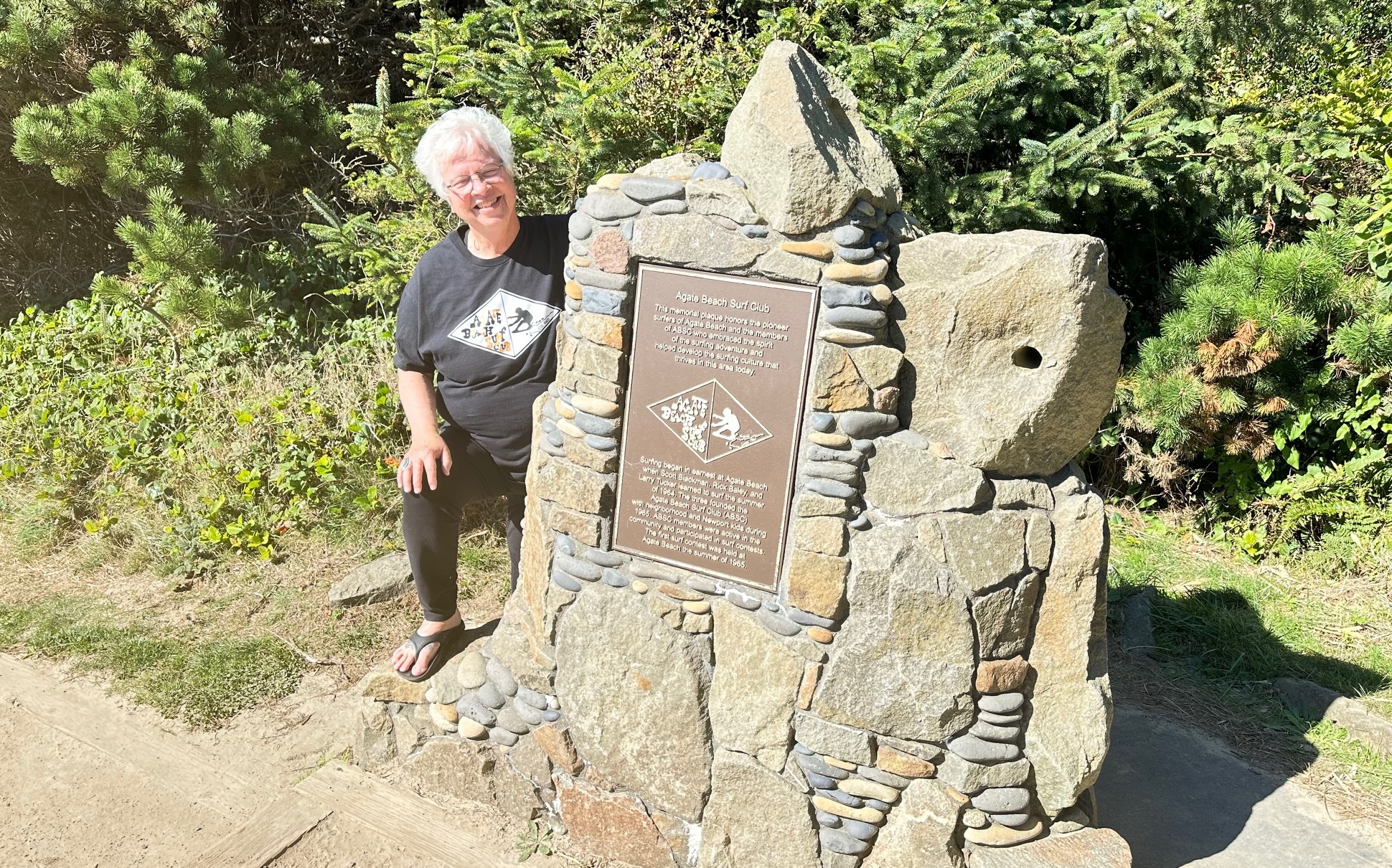 A: I was a small part of the beginning of surfing at Agate Beach – I was one of the many high school students who skipped school occasionally to rush to the beach to watch the surfers. Scott Blackman’s name was whispered in hushed tones throughout the hallways. It was a remarkable gift to cross paths with him later in life, marry him and collaborate with him.