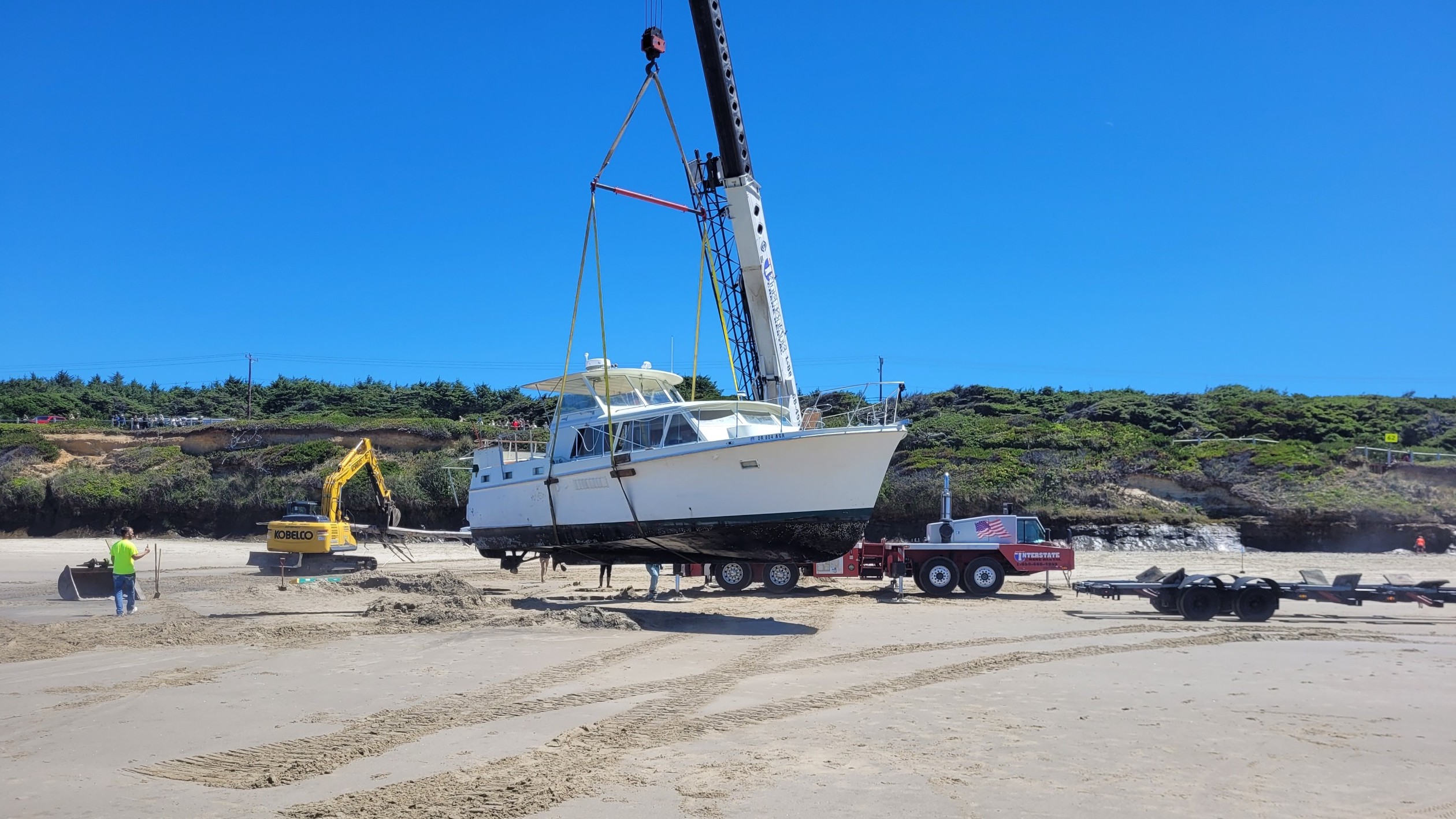 By QUINTON SMITH/YachatsNews The Empress is off the beach – and in Toledo for inspection and repairs. Crews from Coastal Towing & Salvage of Ilwaco, Wash. used an excavator, crane and special trailer Saturday to get the 41-foot, 16-ton cabin cruiser off the beach at Lost Creek state recreation site seven miles south of Newport. Getting plucked from the
