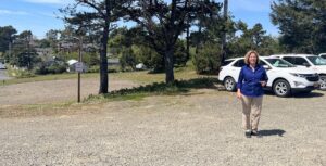 Quinton Smith / Lincoln Chronicle Senior project engineer Gail Malcolm shows where a small hill will be removed on Central Lincoln PUD’s 5-acre site in Newport to construct a new headquarters building.