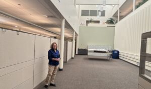 Quinton Smith / Lincoln Chronicle Central Lincoln PUD senior project engineer Gail Malcolm stands in the passive solar area that was supposed to help heat the utility’s headquarters, but never really worked well.