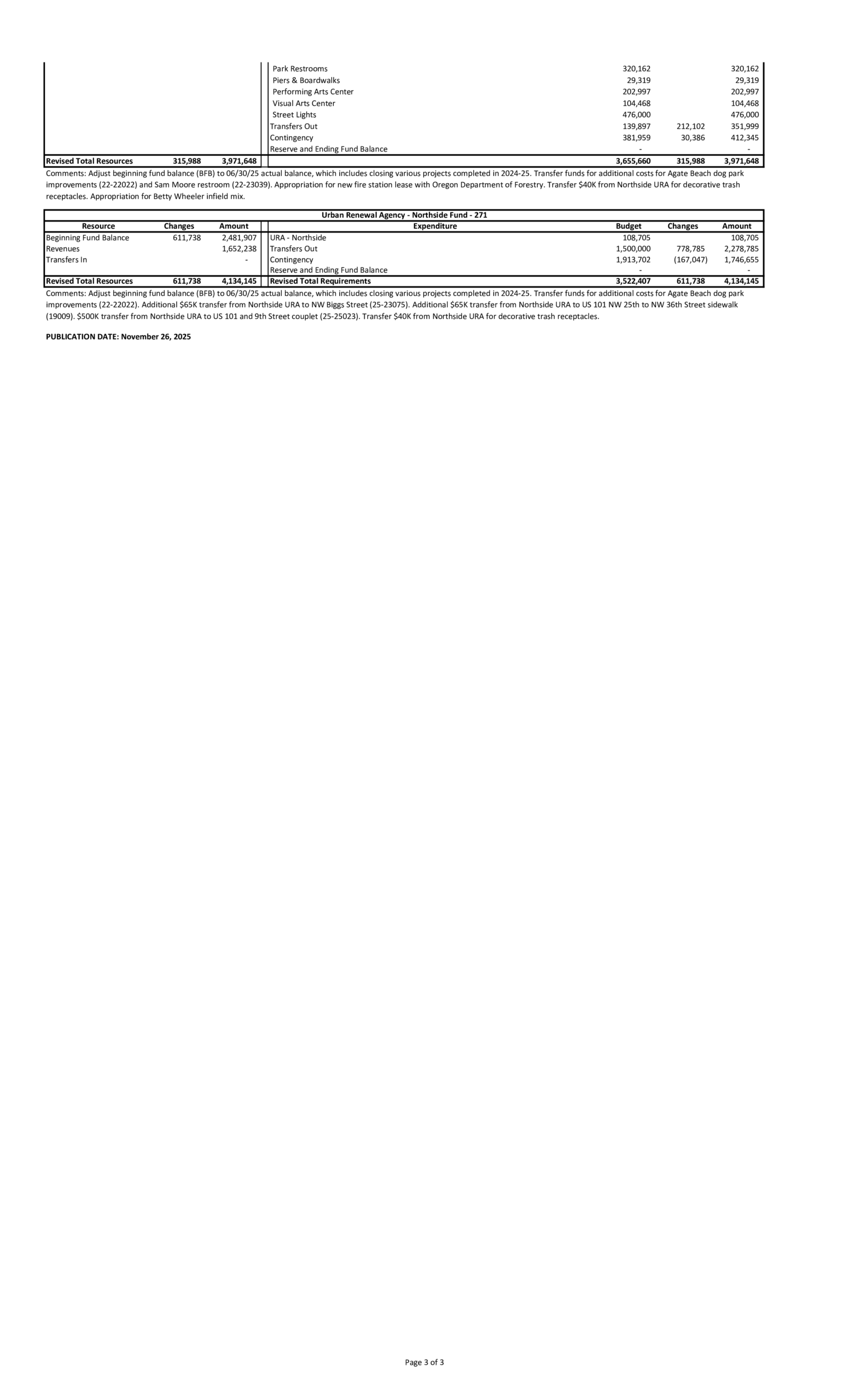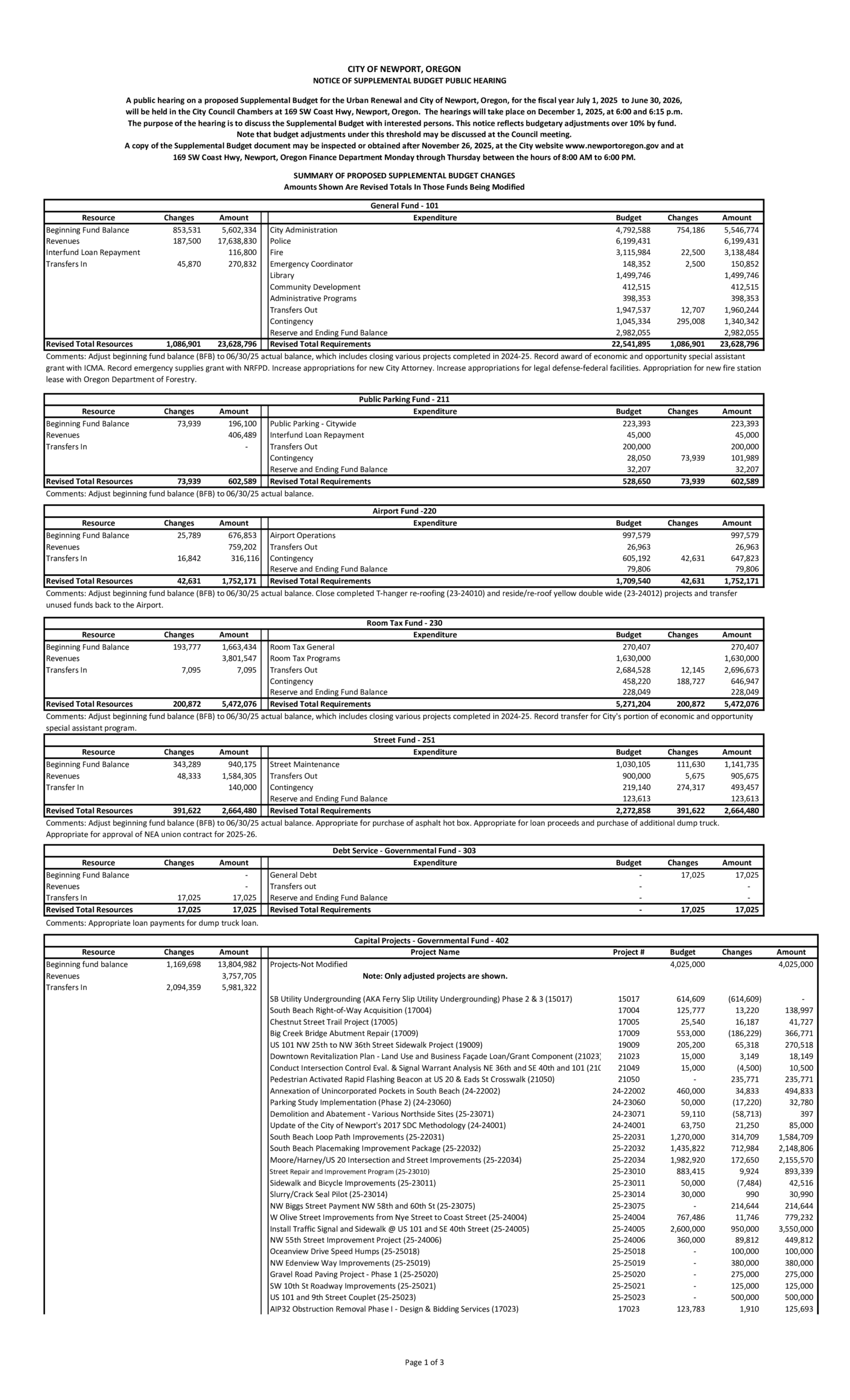 A public hearing on a proposed Supplemental Budget for the Urban Renewal and City of Newport, Oregon, for the fiscal year July 1, 2025 to June 30, 2026, will be held in the City Council Chambers at 169 SW Coast Hwy, Newport, Oregon. The hearings will take place on December 1, 2025, at 6:00 and 6:15 p.m. The purpose of the hearing is to discuss the Supplemental Budget with interested persons. This notice reflects budgetary adjustments over 10% by fund. Note that budget adjustments under this threshold may be discussed at the Council meeting.