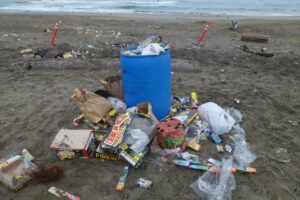Surfrider Foundation Barrels placed on the beach by the Surfrider Foundation to collect fireworks are quickly filled to overflowing each year.