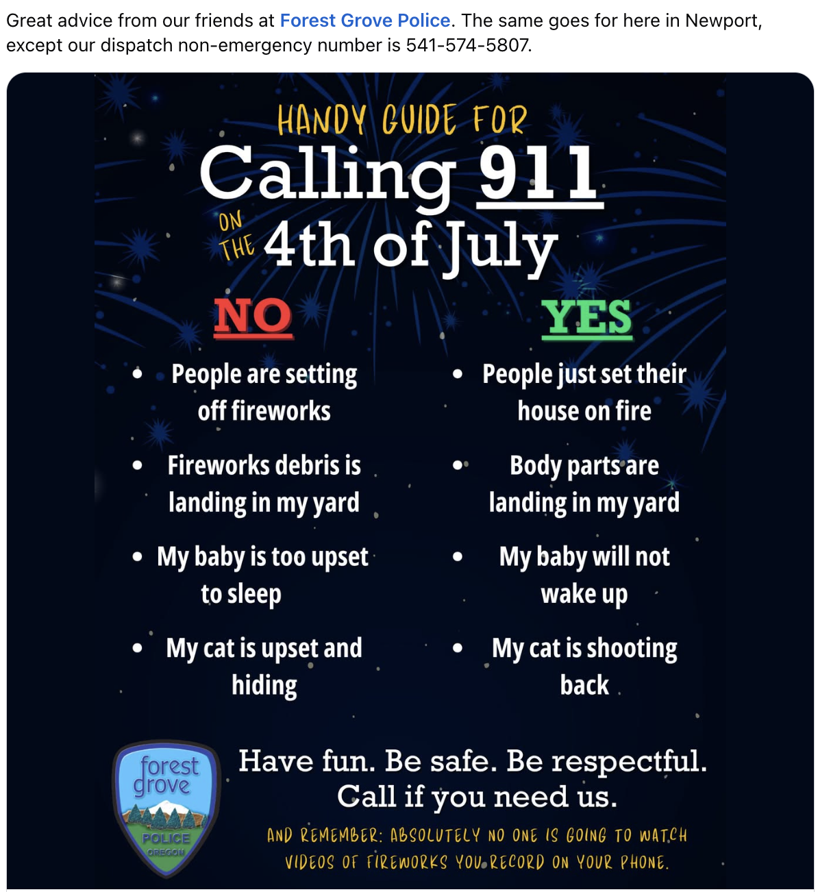 The Newport Police Department, which has an active and often humorous social media account, posted a tongue-in-cheek graphic on its Facebook page entitled “Handy Guide For Calling 911 on the Fourth of July” in which it listed when not to call and when to call the emergency only number.