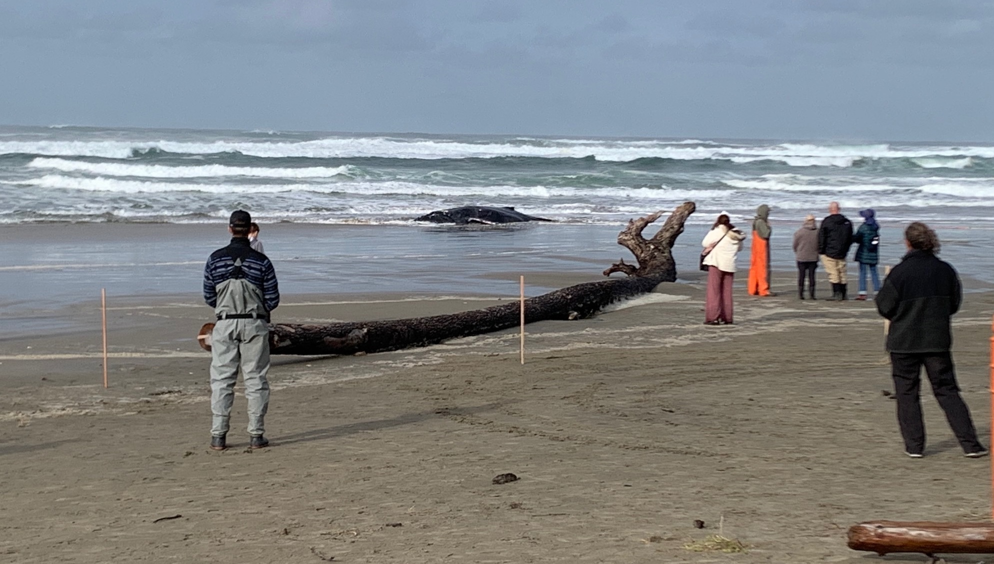 Cascadia whale biologist John Calambokidis said the main goal of the pulley and rope system was to try to get the whale oriented so that it was aimed out to sea and then preserve any gains as it was hit by the incoming waves, which he said were much bigger at the time.