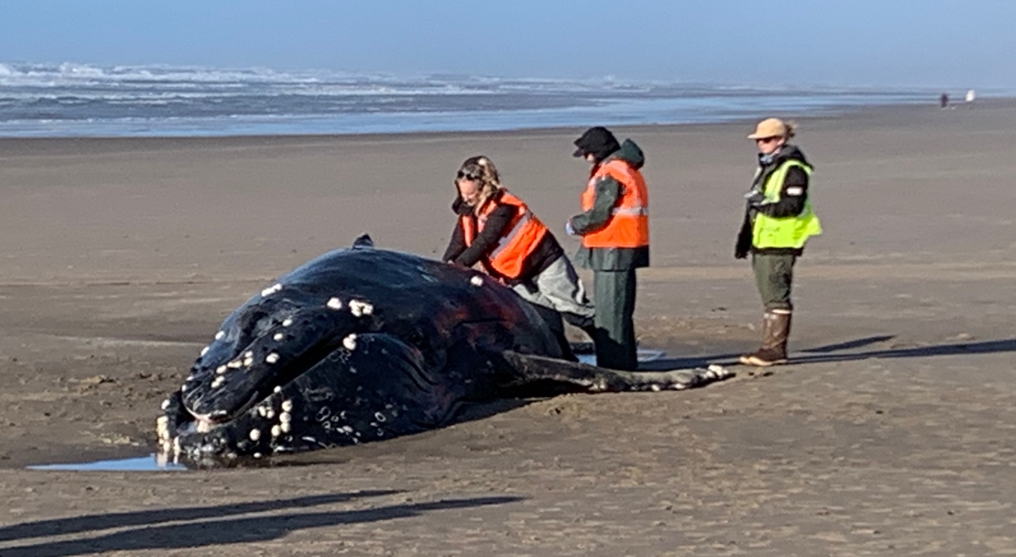 Veterinarians and whale biologist did manage to examine the humpback Sunday afternoon before having to retreat from the incoming tide.