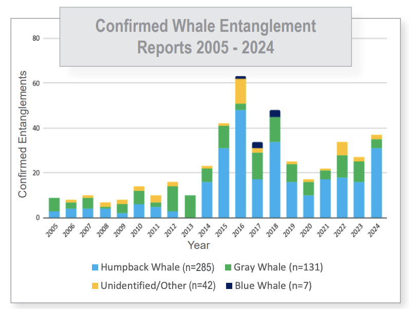 But because of their migration pattern which is changing due to climate change, NOAA Fisheries said it has responded to an increasing number of entanglements reported to the West Coast Marine Mammal Stranding Network.