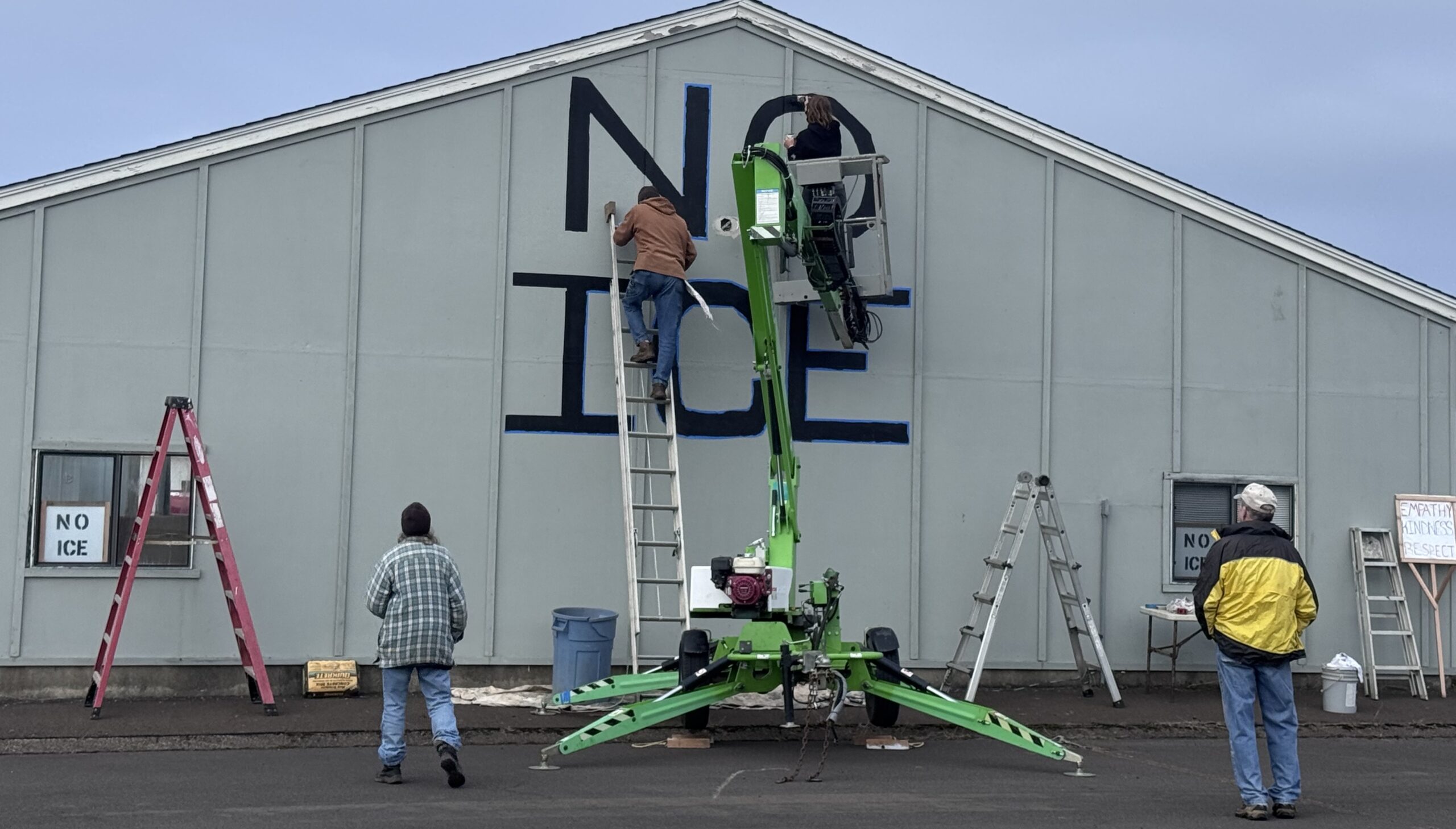 NEWPORT – A group of pilots stood at the Newport airport Sunday holding signs in the rain and behind them, looming in large bold-face letters were the words “No ICE” painted across a hangar for Oregon Sen. Ron Wyden to see.