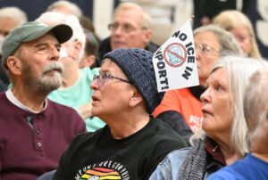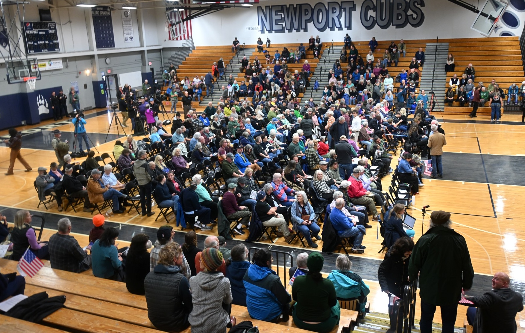 Alan Roberts drove to the town hall from Springfield and wore a small flag attached to his hat that read “No ICE in Newport”.