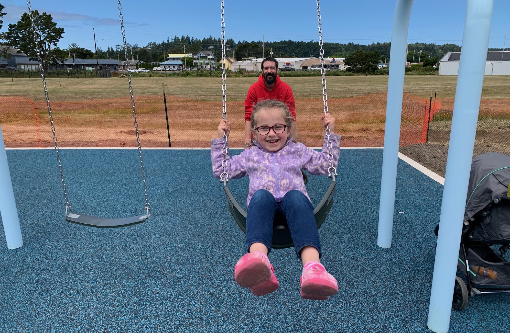 Her dad Clifford Morris, who grew up in Waldport, gave her a quick reminder that it was summer before continuing to push her on the swing.