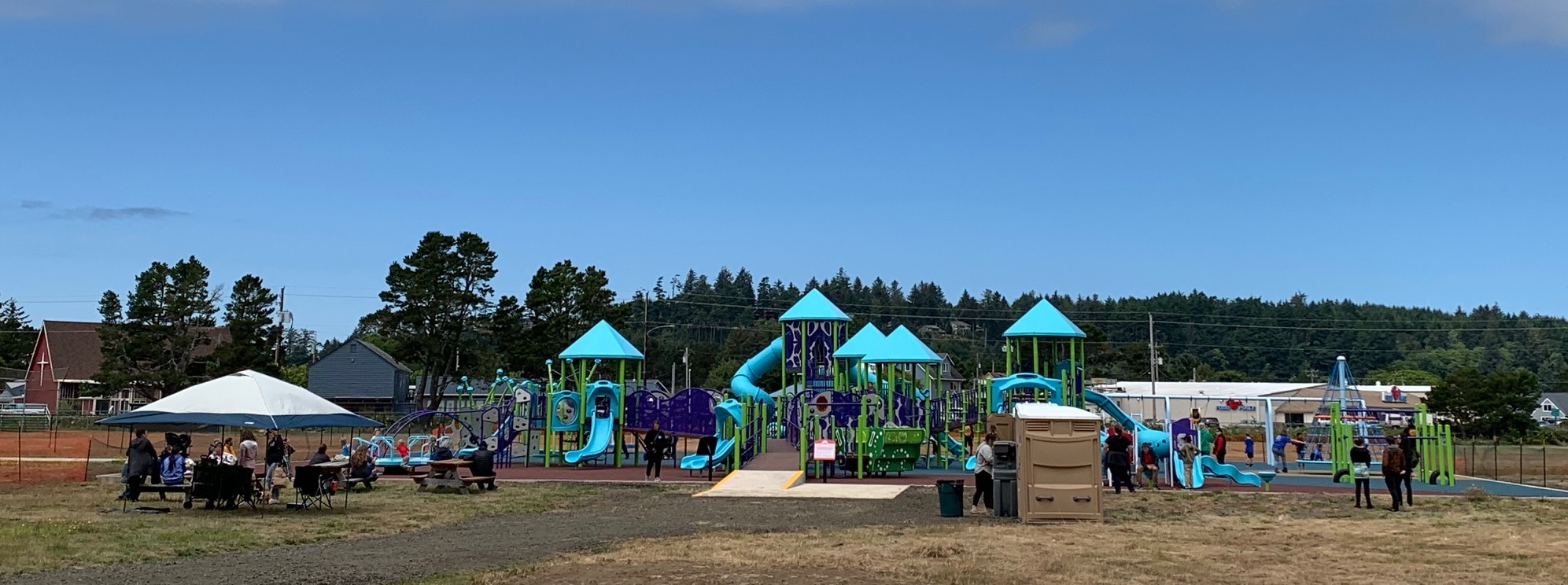 The 14,000-square foot playground was paid for by a grant from Oregon State Parks and then erected in a week last fall by a cadre of volunteers. The delay in opening was due to warmer weather required for laying its soft surface.
