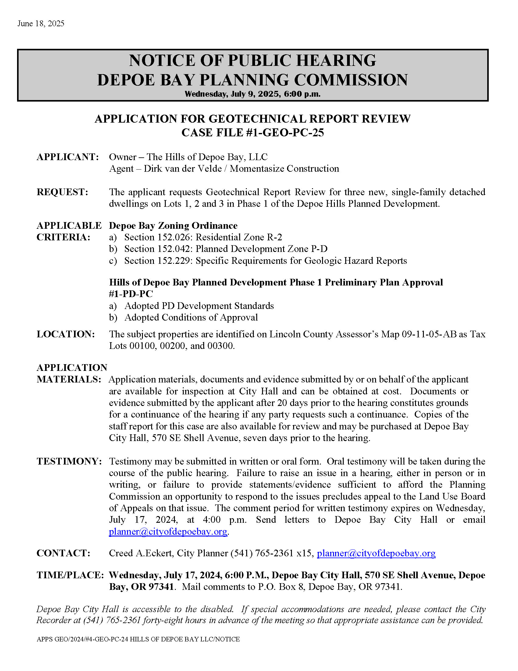 Public & Legal Notices NOTICE OF PUBLIC HEARING DEPOE BAY PLANNING COMMISSION June 20, 2025 Facebook X Bluesky Linkedin Email Letters from readers Look at Medicare Advantage plans carefully before making a decision Lincoln County has benefitted from Hall’s service for 20 years Jacobi urges voters to not sign Hall recall petition More letters Obituaries Marie Jones of Newport Rebecca L. Bloch of Yachats Sandra Lee Dunn of Yachats More obituaries Civic Calendar Oct 21 10:00 am Southwest Lincoln Water People’s Utility District board Oct 21 2:00 pm - 4:00 pm Yachats Planning Commission monthly workshop and meeting Oct 27 6:00 pm - 8:00 pm Newport Planning Commission work session and regular meeting Nov 4 2:00 pm - 4:00 pm City of Yachats Parks & Commons Commission Nov 6 7:00 pm - 9:00 pm Yachats Big Band monthly concert Nov 10 10:30 am - 12:00 pm Yachats Rural Fire Protection District board Nov 11 10:00 am - 11:30 pm Yachats Planning Commission monthly workshop meeting Nov 11 2:00 pm - 3:30 pm Yachats Public Works & Streets Commission Nov 11 5:00 pm - 8:00 pm Lincoln County School District board of directors Nov 13 4:00 pm - 5:30 pm Waldport City Council View Calendar