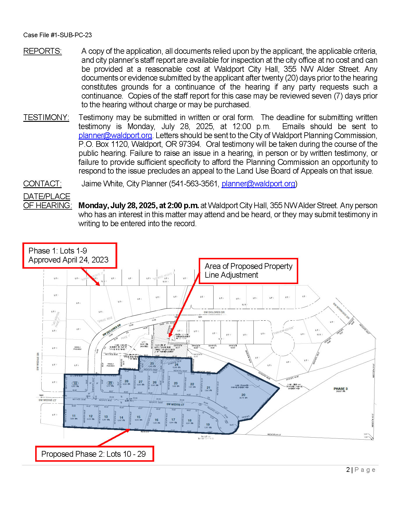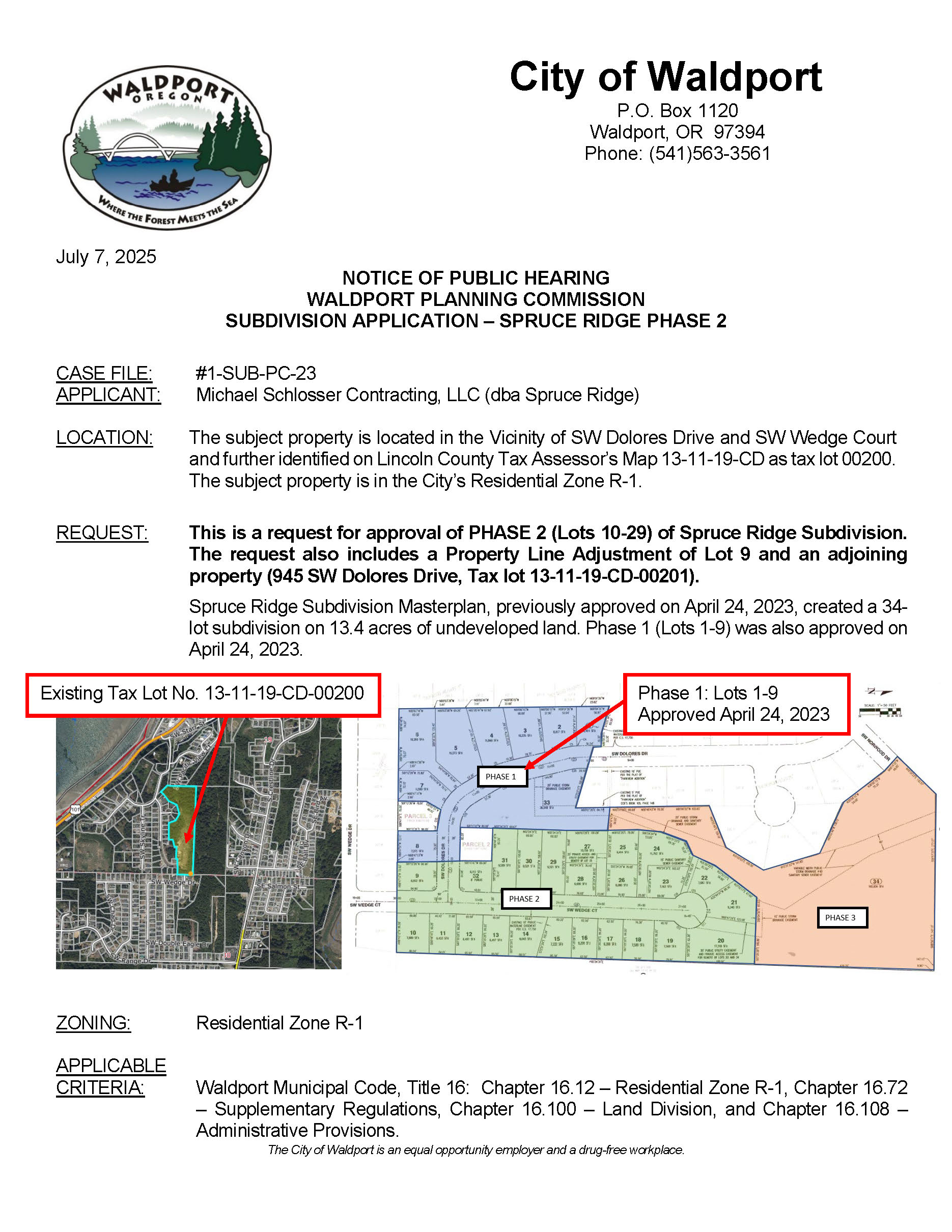 Public & Legal Notices NOTICE OF PUBLIC HEARING WALDPORT PLANNING COMMISSION SUBDIVISION APPLICATION – SPRUCE RIDGE PHASE 2 July 7, 2025 Facebook X Bluesky Linkedin Email Letters from readers $25,000 grant will help View the Future’s community conversations Look at Medicare Advantage plans carefully before making a decision Lincoln County has benefitted from Hall’s service for 20 years More letters Obituaries Marie Jones of Newport Rebecca L. Bloch of Yachats Sandra Lee Dunn of Yachats More obituaries Civic Calendar Oct 21 10:00 am Southwest Lincoln Water People’s Utility District board Oct 21 2:00 pm - 4:00 pm Yachats Planning Commission monthly workshop and meeting Oct 27 6:00 pm - 8:00 pm Newport Planning Commission work session and regular meeting Nov 4 2:00 pm - 4:00 pm City of Yachats Parks & Commons Commission Nov 6 7:00 pm - 9:00 pm Yachats Big Band monthly concert Nov 10 10:30 am - 12:00 pm Yachats Rural Fire Protection District board Nov 11 10:00 am - 11:30 pm Yachats Planning Commission monthly workshop meeting Nov 11 2:00 pm - 3:30 pm Yachats Public Works & Streets Commission Nov 11 5:00 pm - 8:00 pm Lincoln County School District board of directors Nov 13 4:00 pm - 5:30 pm Waldport City Council View Calendar