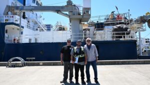 Shayla Escudero / Lincoln Chronicle Longshoreman Mike Fogarty, from left, stevedore Ryan Castro, and ILWU president Tracy Burchet stand in front of the R/V Atlantis after offloading cargo this summer. After a contentious history and the termination of a major project, the Port of Newport is hoping to bring more cargo jobs to the International Terminal.