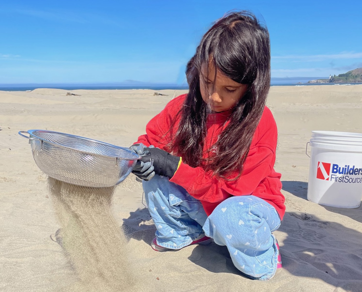 Cleanup participants are directed to park at the Agate Beach Best Western Hotel, which is supporting the effort by allowing Rotary to use their loading dock and parking lot. They assemble at the adjacent beach and are instructed in the use of a sieve-like screen filter that captures the particles as beach sand is sifted through. When the filter becomes loaded with plastic, it’s tipped into five-gallon buckets for removal. It takes two people to hold the filter and another to shovel the sand, so the process becomes a group effort that requires a measure of teamwork.