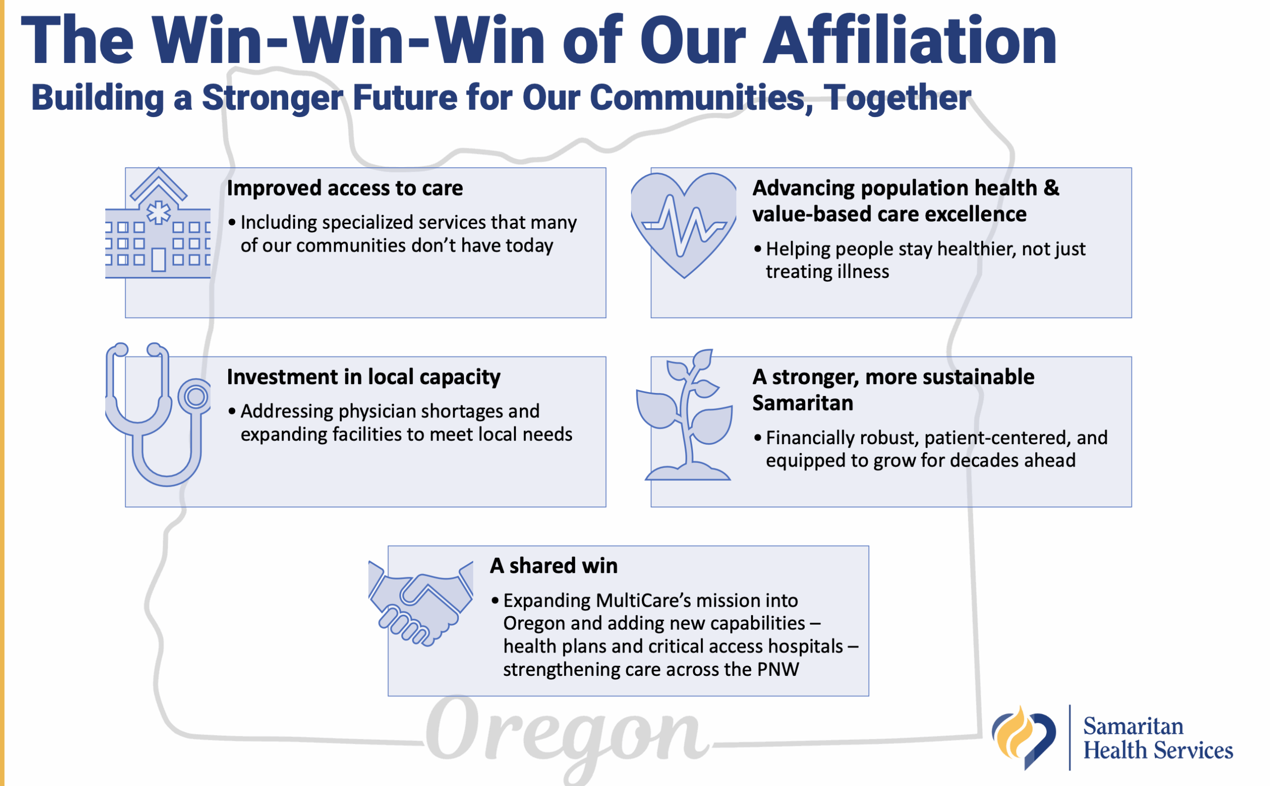 “They want to, in the next five years, take care of one-third of the population in the Northwest,” Cahill said. “Samaritan was the opportunity they were looking for in Oregon.”